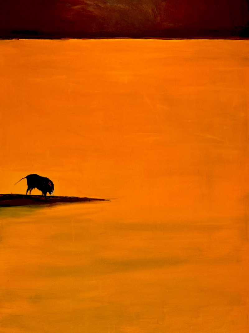 In “Abisso”, Vasquez Montiel René Alberto, in arte Vasquez, riduce il linguaggio pittorico all’essenziale, costruendo un’immensa distesa arancio infuocata interrotta da una sottile linea d’orizzonte e da una minuscola figura taurina. L’olio su tela amplifica la profondità cromatica, trasformando il campo monocromo in spazio mentale. La composizione minimalista, quasi astratta, accentua il senso di solitudine e vertigine evocato dal titolo. Il toro, isolato e scuro, diventa simbolo di resistenza o smarrimento davanti all’infinito. L’opera unisce color field e tensione narrativa, evocando in modo contemplativo il concetto di vastità.