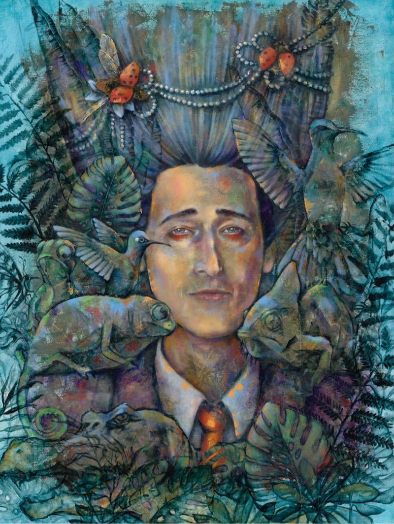 Il ritratto “Adrien Brody” di Yana Liubarska (in arte Yanaly) è un’opera magnetica che fonde realismo e surrealismo. Attraverso l’uso dell’oil on canvas, l’artista immerge il volto dell’attore in una giungla simbolica popolata da camaleonti e colibrì. Yanaly gioca con i contrasti cromatici, accostando la fredda profondità degli sfondi azzurri al calore dello sguardo del protagonista. In questa composizione, Yana Liubarska esplora l’interconnessione tra uomo e natura, trasformando una figura iconica in un’icona onirica e selvaggia. L’opera diventa così un palcoscenico visivo dove la celebrità si spoglia del suo ruolo pubblico per farsi tramite di un’armonia primordiale e misteriosa.