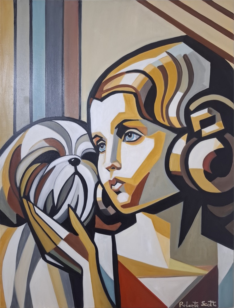 Roberta Scatt rielabora la lezione cubista attraverso un linguaggio levigato e contemporaneo. L’olio su tela costruisce volumi netti e campiture compatte, dove linee marcate e piani cromatici scompongono i volti in geometrie armoniche. La donna e il cane condividono uno spazio intimo e silenzioso, che suggerisce complicità e affetto oltre le differenze. I toni caldi – ocra, ambra, bruni – dialogano con azzurri e grigi, creando equilibrio e profondità. L’opera, “In Amiche diverse”, colpisce per chiarezza formale e coerenza stilistica, offrendo una visione elegante dell’amicizia come incontro tra identità distinte ma complementari.