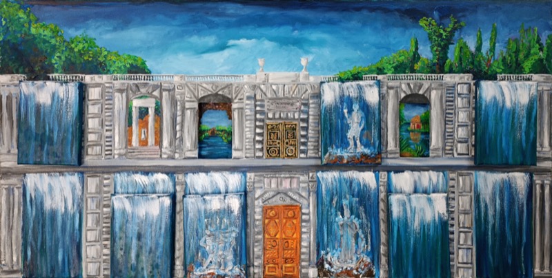 “Arcquartico” di Francesco Bonadio, in arte Welladio, si presenta come una visione architettonica immaginaria, sospesa tra classicità e sogno. La pittura a olio costruisce una facciata monumentale scandita da arcate, nicchie e cascate d’acqua, dove l’ordine razionale dell’architettura dialoga con la fluidità naturale. Le aperture diventano soglie simboliche, affacci su paesaggi interiori e mitici, mentre le figure scultoree emergono come presenze archetipiche. L’opera evoca un luogo mentale, un atlante poetico in cui tempo, memoria e natura si fondono, offrendo allo spettatore un’esperienza contemplativa e narrativa insieme.