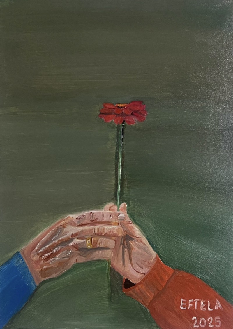 L’opera “Bridge of Life” di Kacori Eftela è un’intensa meditazione visiva sulla connessione umana e la fragilità dell’esistenza. L’uso sapiente dell’olio su tela permette di rendere con crudo realismo la texture delle mani intrecciate, i cui solchi e rughe narrano il passare del tempo. Il contrasto cromatico tra le maniche — una blu freddo, l’altra arancio vibrante — suggerisce l’incontro di due mondi o polarità che trovano un punto di equilibrio nel sostenere un unico, delicato fiore rosso. Questo stelo, teso come una corda, funge da vero “ponte” (come suggerisce il titolo), elevando la vita dalla densità di uno sfondo scuro e materico verso una speranza resiliente.