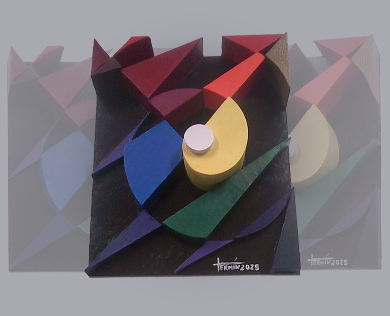 L’opera “Circulo cromatico vital…” di Fermín Montoya, in arte Fermin, è un’indagine tridimensionale sulla forza costruttiva del colore e della geometria. Con una profondità di 8 cm, la composizione si distacca dal piano pittorico tradizionale, trasformandosi in un bassorilievo vibrante. L’artista organizza solidi geometrici dai colori primari e secondari — gialli solari, blu profondi e verdi intensi — che sembrano gravitare attorno a un fulcro centrale. La struttura rompe la staticità del supporto, creando un ritmo visivo che gioca con luci e ombre reali. È un’opera che celebra la vitalità dell’astrazione, dove il “circulo” si manifesta in un organismo dinamico che invade lo spazio fisico dell’osservatore.