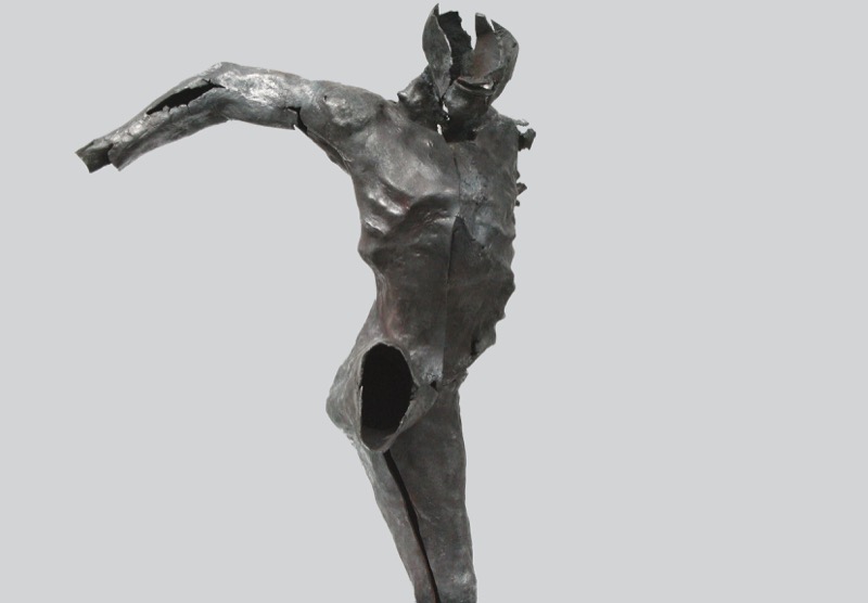 Manfred Heller plasma il ferro battuto per dar vita a una figura di drammatica potenza espressiva dal titolo “Damien”. La scultura si presenta come un torso frammentato e lacerato, dove la durezza del metallo viene piegata per narrare la vulnerabilità della condizione umana. Le cavità profonde e le superfici irregolari creano un gioco di ombre che accentua il senso di sofferenza e resilienza. Heller trasforma la materia grezza in un corpo dinamico ma mutilato, sospeso in uno sforzo plastico che evoca eroismo e caduta. La scelta del ferro non è solo tecnica, ma simbolica: rappresenta una forza che resiste al tempo, pur portandone i segni indelebili.