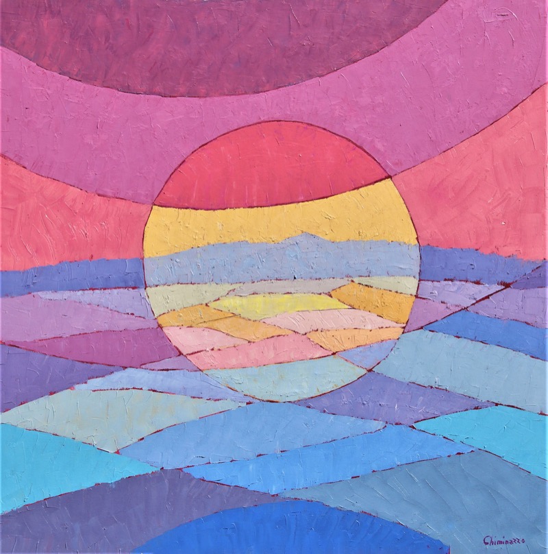In Dinamismo nella campagna n.2, Gianni Chiminazzo trasfigura il paesaggio rurale in una potente sintesi geometrica. L’opera si struttura attorno a un fulcro circolare che agisce come una lente cromatica, frammentando la luce in fasce orizzontali sovrapposte. La tecnica a olio è materica, vibrante, e definisce i volumi attraverso una stesura quasi musiva del colore. Il dinamismo citato nel titolo non è dato dal movimento fisico, ma dalla tensione ritmica tra le calde tonalità del cielo e le fredde ondulazioni del terreno. Chiminazzo riesce a distillare l’essenza della natura, trasformando la quiete campestre in un’architettura di forme pure e contrasti cromatici audaci.