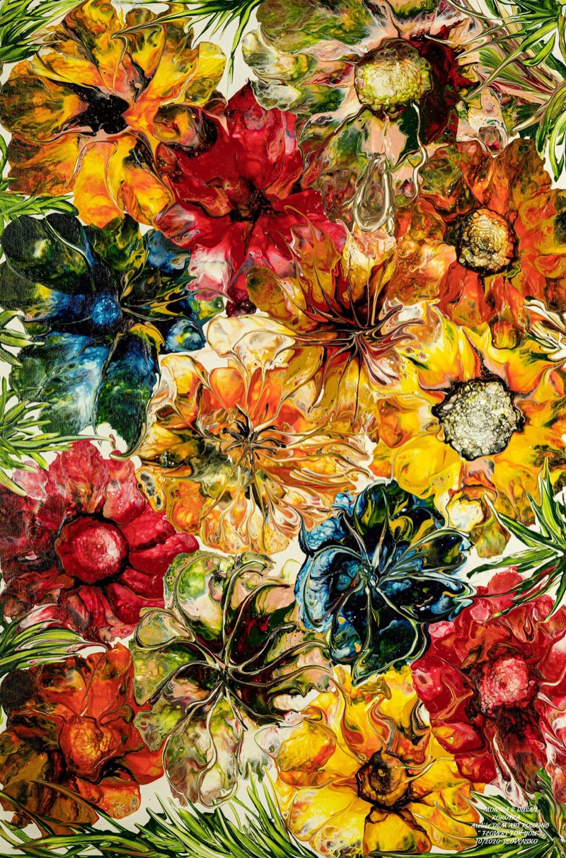 In “Flowers for harry are flowers for you”, Dušan Kokoška (D M Art Pouring) eleva il pouring ad alchimia controllata. L’opera esclude il pennello, usando aria compressa e stratificazioni calibrate. Grazie a una formula proprietaria per la viscosità dei pigmenti, l’artista crea un giardino psichedelico dove le corolle pulsano di vita. D M Art Pouring trasforma il fluido in precisione, orchestrando colate che evocano una fioritura eterna. La brillantezza dei toni e la conciatura del colore invitano a un’energia vitale, rendendo l’omaggio floreale un’esperienza sensoriale, materica e profondamente immersiva.