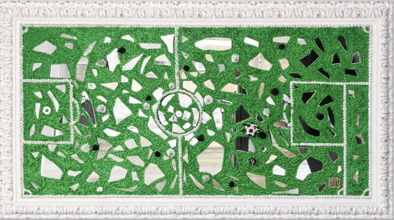 “Green” di Andrea Mellone, in arte MysArts, è un’opera che unisce materia, riflessione e spazio in una composizione vibrante e concettuale. Il puntinismo, combinato con acrilico e silicone, costruisce una superficie pulsante, mentre gli inserti di specchio frammentano l’immagine e coinvolgono direttamente lo spettatore. Il verde dominante diventa simbolo di natura, rigenerazione ed equilibrio, ma anche di fragilità, spezzata dalle rifrazioni irregolari. La struttura modulare richiama mappe, circuiti o giardini astratti, trasformando l’opera in un campo percettivo dinamico, configurandosi così come esperienza visiva e sensoriale, dove arte e ambiente dialogano.