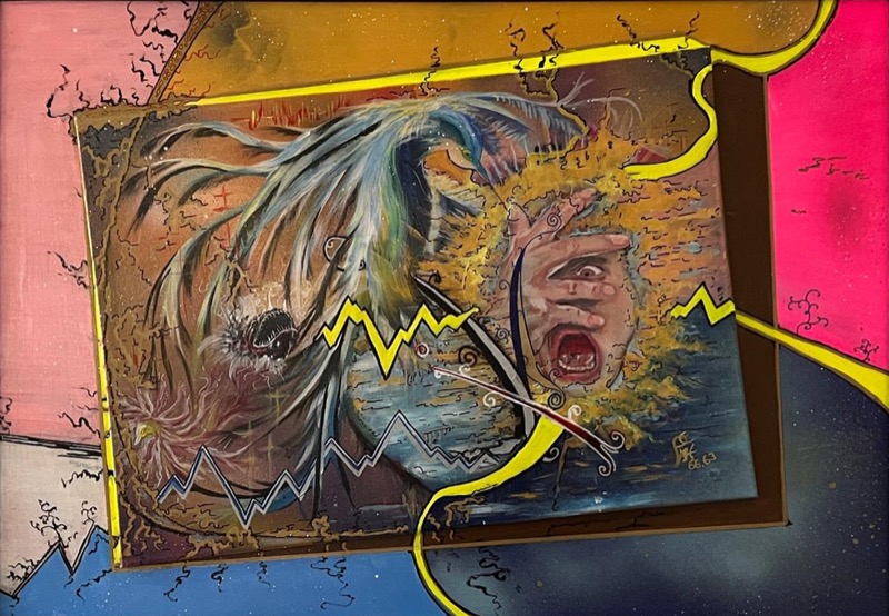 In “Harassed – the hummingbird (2024)”, ethane (Egon Prijon), realizza un’opera acrilica su tela di grandi dimensioni, carica di una tensione psicologica ed estetica dirompente. La composizione frammentata e dinamica mette in scena un conflitto visivo tra elementi organici e segni grafici taglienti, come saette gialle che squarciano lo spazio. Al centro, un volto urlante emerge da una densa materia pittorica, evocando un senso di oppressione e smarrimento esistenziale. L’uso di colori acidi e contrastanti accentua il dinamismo di un’opera che sembra esplodere oltre i propri confini, trasformando il tormento interiore in un’esperienza visiva magnetica, inquieta e profondamente contemporanea.