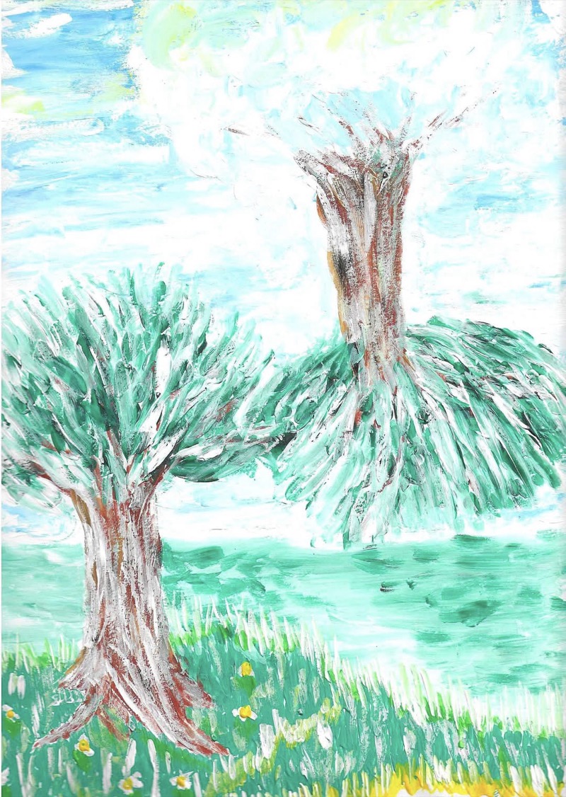 Con “I gemelli”, Giovanni Turin propone una visione intima e surreale, in cui la natura diventa metafora di legami profondi. Due alberi, uniti da un innesto inaspettato, suggeriscono affinità invisibili: sangue, destino, memoria condivisa. L’uso congiunto di acrilico e tempera dà vita a una materia pittorica vibrante, dove ogni pennellata, rapida e densa, suggerisce movimento e vitalità. Il verde e l’azzurro dominano la scena, trasmettendo sensazioni di armonia e rinascita. Lo stile, volutamente ingenuo ma carico di espressione, parla più al cuore che all’occhio. Nonostante il piccolo formato, l’opera comunica con forza, lasciando un’impronta intensa e duratura.