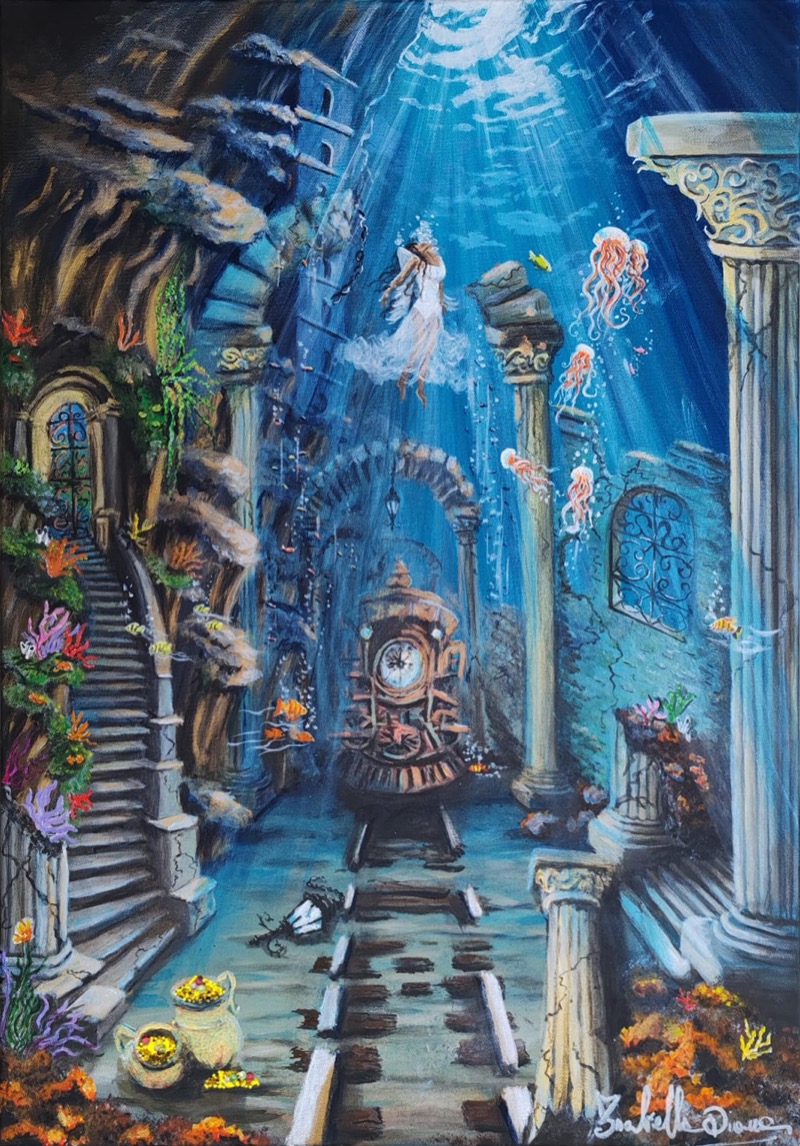 In quest’opera di Isabella Diana, “In viaggio nella città sommersa”, la più grande ricchezza si nasconde nel profondo del subconscio” l’artista ci conduce tra resti classici e binari ferroviari, suggerendo un viaggio atemporale nel subconscio. L’uso dell’acrilico permette una resa vibrante dei fasci di luce che squarciano l’abisso blu, illuminando meduse eteree e una figura angelica in ascesa. La ricchezza cromatica dei coralli e degli ori sommersi funge da contrappunto alla solennità delle rovine. Isabella trasforma la tela in una soglia psicologica: l’osservatore è invitato a scendere nel profondo per riscoprire tesori dimenticati, in un perfetto equilibrio tra surrealismo e narrazione fiabesca.