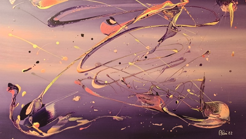 Claudio Barberis, con “Indescrivibile bellezza”, orchestra un vortice visivo dove gesto, materia e colore si fondono in un’elegante sospensione. La tavolozza, dominata da sfumature violacee e accenti fluo, richiama un tramonto cosmico intriso di energia e mistero. L’uso di acrilico, isolante per muri e silicone arricchisce la superficie con profondità tattile e tensione organica, trasformando l’opera in un campo di forze dinamiche. Il titolo evoca un paradosso molto affascinante: ciò che è “indescrivibile” si rivela attraverso poesia astratta e intensità visiva. È un’opera che celebra l’enigma, tra luce, materia, caos, equilibrio, intuizione e bellezza primordiale.