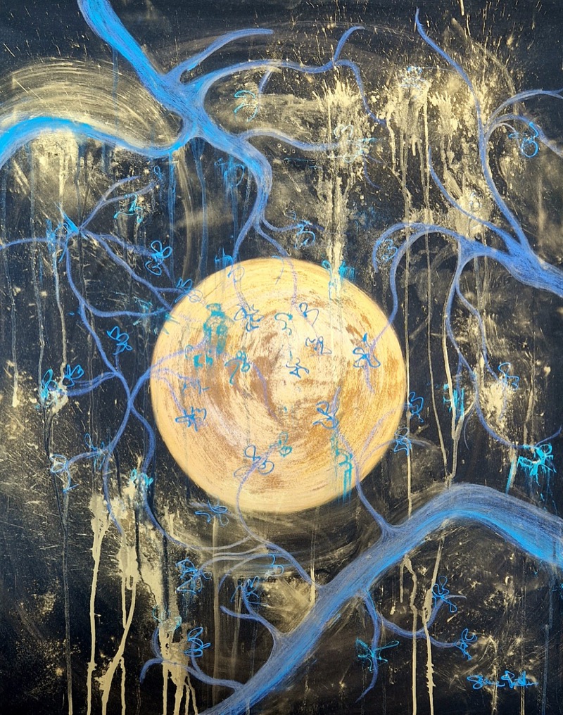 L’opera “Inspirations from Japan” di Silvia Pastano si distacca dall’astrazione pura grazie a una fisicità prepotente: l’uso della sabbia naturale non è solo decorativo, ma crea una superficie scabra che trattiene la luce in modo irregolare, simulando la porosità delle rocce dei giardini zen. Su questa base materica, il cerchio centrale agisce come un magnete visivo con una solidità quasi metallica. Le linee blu solcano lo sfondo scuro, creando un contrasto di lucentezza rispetto alla finitura opaca dell’acrilico. Le grandi dimensioni della tela permettono a queste ramificazioni di espandersi con un ritmo muscolare, creando una mappa di tensioni dove il calore dell’oro cerca di bilanciare la fredda energia del blu.