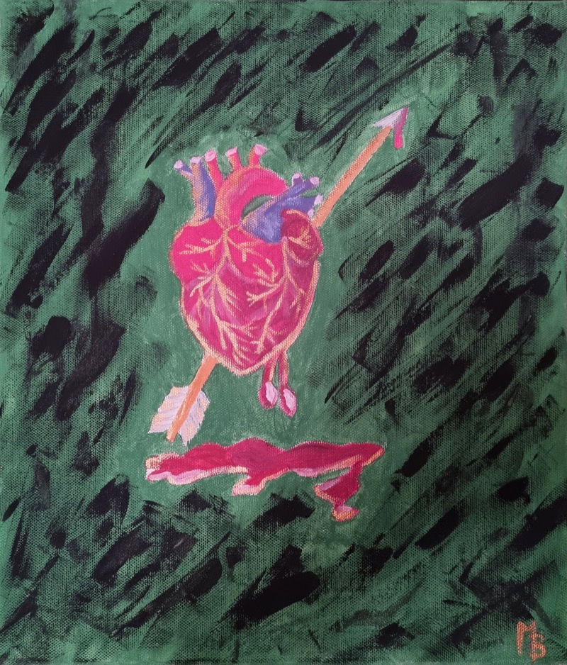 In “Keep moving forward with Passion and Love”, Mirela Botorogeanu esplora la resilienza umana attraverso un linguaggio visivo simbolico e viscerale. Al centro della tela, un cuore anatomico, trafitto ma pulsante, diventa l’emblema di una vitalità che non si arrende al dolore. L’uso degli acrilici, stesi con pennellate dinamiche e materiche su uno sfondo verde bosco solcato da tratti neri, crea un senso di urgenza e movimento. La freccia che attraversa l’organo non rappresenta una fine, ma una spinta direzionale, un invito a procedere nonostante le ferite. L’opera trasforma la sofferenza in una forza propulsiva verso il futuro.