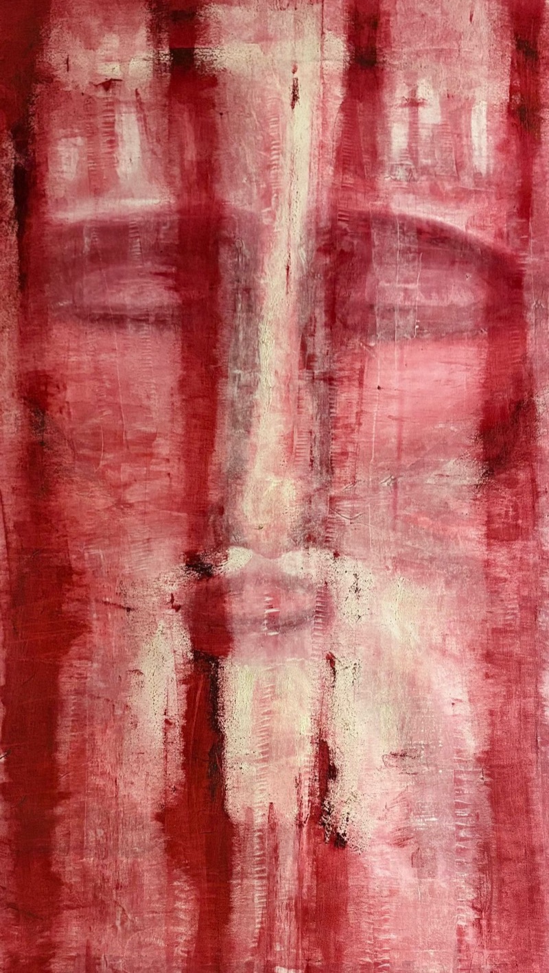 Non è un volto che si offre allo sguardo, ma un’apparizione che emerge dalla materia. “La Sacra Sindone”, di Mimmiscio, costruisce un’immagine sospesa tra figurazione e dissolvenza, affidando alla tecnica mista – olio su acrilico – una superficie vibrante, stratificata, quasi ferita. Le velature rosse dominano la composizione, evocando carne, sofferenza e trascendenza, mentre il volto affiora come un’impronta più che ritratto. La verticalità accentua il senso di icona contemporanea, in bilico tra spiritualità e astrazione informale. L’opera colpisce per intensità emotiva, trasformando la memoria sacra in esperienza pittorica materica e profondamente introspettiva.