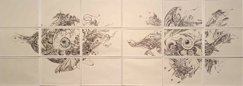 In quest’opera (184×130 cm) di Yulia Gladkaya, in arte Birò, eleva la penna a sfera a strumento di precisione chirurgica e visionaria. L’installazione, composta da nove disegni su diciotto carte fissate magneticamente, crea un polittico contemporaneo dove il segno grafico si fa fitta trama organica. “La storia d’amore di due krakozyaba” è un’architettura di linee che genera creature fantastiche e metamorfiche, in cui dettagli oculari e filamenti biomorfi si intrecciano in un dinamismo barocco. La scelta di un mezzo espressivo così quotidiano contrasta con la complessità del risultato finale, trasformando il gesto seriale del disegno in un’esplosione onirica.