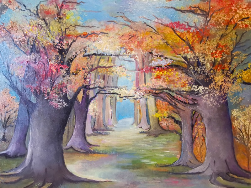 In “La via del sogno”, Rossana Caserta, in arte CRoss1, costruisce un’immagine sospesa, dove il paesaggio naturale diventa metafora di un cammino interiore e visionario. Il sentiero alberato, scandito da tronchi maestosi e rami fioriti, guida lo sguardo verso una profondità luminosa, metafora di un percorso intimo e immaginativo. L’olio su tela è steso con una materia morbida e vibrante, in cui i toni caldi dell’autunno dialogano con azzurri rarefatti, creando un equilibrio armonico. La composizione invita alla contemplazione e al silenzio, suggerendo il sogno come spazio di passaggio tra realtà e desiderio, memoria e possibilità.