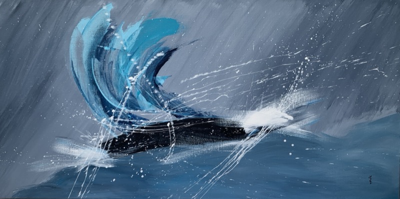 Con la potente composizione “Le Bateau Ivre”, Marie Line Le Bronnec dà forma a un dinamismo astratto che sembra tradurre visivamente la frenesia dell’omonimo poema di Rimbaud. L’artista orchestra una tempesta cromatica dominata da blu profondi e bianchi spumeggianti, dove pennellate ampie e decise evocano la forza indomabile del mare. La struttura orizzontale della tela esaspera il senso di velocità: il “battello” non è una figura definita, ma un’energia che fende le onde, lasciando dietro di sé scie di luce e spruzzi di materia. Le Bronnec riesce a catturare l’essenza della libertà assoluta e del caos primordiale, trasformando l’opera in un oceano emotivo dove lo spettatore viene travolto da una gestualità istintiva e potente.