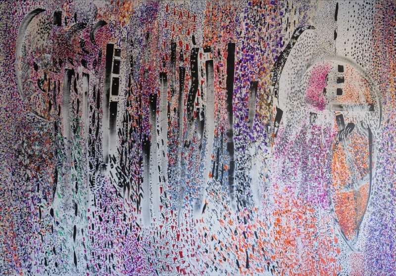 Con la monumentale tela “Les bouleversantes énergies qui étreignent nos vies follement hermétiques”, l’artista Titouan Péron satura lo spazio visivo creando un ecosistema vibrante, in cui la pittura e l’inchiostro generano una pioggia incessante di segni. L’opera visualizza il conflitto tra l’isolamento individuale e l’irruenza delle forze esterne: campiture di viola e arancio fluttuano come nubi cariche di tensione, mentre le strutture nere verticali evocano architetture mentali o urbane che tentano invano di contenere il caos. È un labirinto di energia pura che obbliga lo sguardo a navigare tra l’ermetismo della forma e la libertà del gesto pittorico.