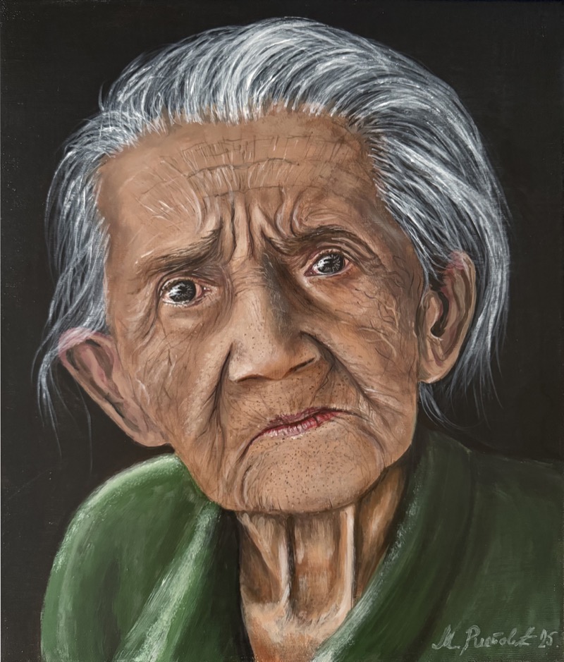 “Life” di Marija Ristovic è un ritratto intenso, carico di umanità e verità pittorica. L’anziana figura centrale, scolpita con minuzia quasi iperrealista, racconta decenni di vita attraverso rughe, sguardo e postura. L’artista usa l’acrilico con straordinaria precisione, sfruttando la resa materica per enfatizzare la profondità dei solchi sulla pelle e la trasparenza emozionale degli occhi. Lo sfondo scuro isola il volto, rendendolo icona della dignità silenziosa e della vulnerabilità umana. Il titolo, Life, è essenziale quanto potente… Un’opera toccante, in equilibrio tra osservazione realistica e pathos universale.