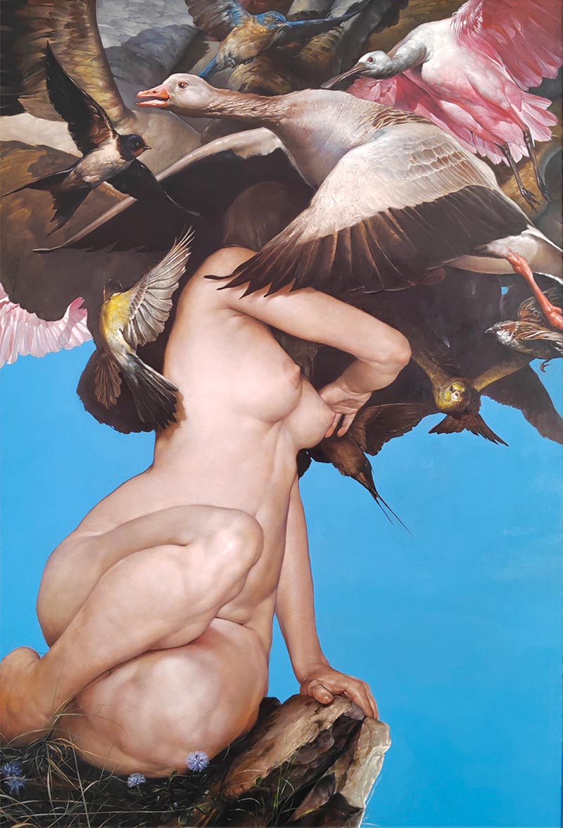 In “L’isola e il molo”, il duo artistico Alejandra e Manuel propone un’opera di forte impatto figurativo e visionario. Un nudo femminile monumentale domina la scena, modellato con una plasticità che rimanda al classicismo rinascimentale e stagliato contro un cielo di azzurro assoluto. La figura, raccolta su una roccia, è avvolta da uno stormo inquieto di uccelli che ne cela il volto, dissolvendo l’identità in un enigma naturale. La pittura a olio consente una resa minuziosa di piume e incarnati, accentuando il contrasto tra immobilità corporea e moto frenetico. “Isola e molo” diventano così metafore di un approdo esistenziale, sospeso.