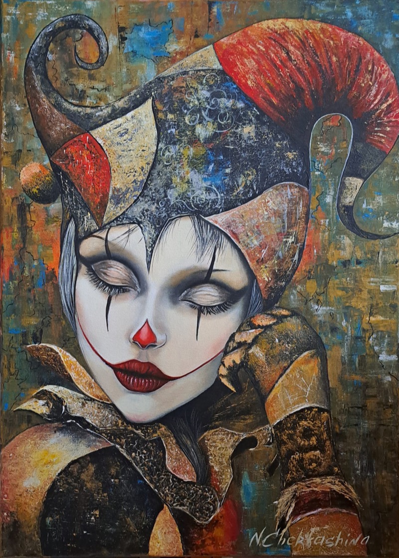 Natalia Cherkashina, con “Malinconia”, ci introduce in un universo emotivo dove la maschera non nasconde, ma rivela. La figura del giullare, filtrata da uno sguardo delicato e moderno, diventa simbolo di fragilità trattenuta. L’acrilico, steso su tela con ricchezza materica, costruisce una superficie vibrante, in cui ocra, rossi e riflessi blu si intrecciano con armonia. Il volto chiuso in sé, elegante e teatrale, comunica un’introspezione profonda. I dettagli del costume, curati e variegati, amplificano il contrasto tra esteriorità e sentimento. Ne emerge una malinconia silenziosa, che affiora dal gesto e dal colore, trasformando il dolore in poesia visiva.