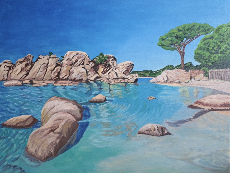 L’opera “Marine Clarity in Corsica” di Genevieve Lakova cattura l’essenza luminosa del Mediterraneo con straordinaria nitidezza. L’artista si focalizza sulla trasparenza delle acque, alternando tonalità di turchese e azzurro che dialogano con la solidità delle formazioni rocciose. Genevieve Lakova utilizza il contrasto tra la staticità dei graniti e la verticalità del pino marittimo per creare un’armonia visiva perfetta. La luce tersa e la cura dei riflessi acquatici trasportano lo spettatore in un istante di pace assoluta. È un paesaggio vibrante che celebra la purezza della natura, trasformando la veduta costiera in una visione poetica e rigenerante.