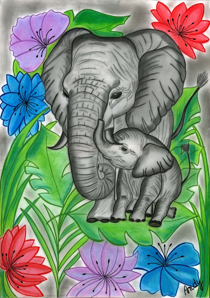 In “Maternal Symphony”, l’artista Andrea Stefanicova (nota come Art By Andy Original) orchestra un delicato equilibrio tra realismo grafico e vivacità decorativa. L’opera celebra il legame primordiale tra madre e figlio attraverso una coppia di elefanti, raffigurati con meticolosa precisione in grafite e carboncino, mettendo in risalto la texture della loro pelle e la saggezza del loro sguardo. Il contrasto tra i toni grigi dei pachidermi e i colori saturi dei fiori crea una vera e propria sinfonia visiva, che amplifica la tenerezza del gesto naturale. Stefanicova trasforma così la tela in un inno alla protezione e alla continuità della vita, dove la forza della natura si fonde con una dolcezza quasi fiabesca.