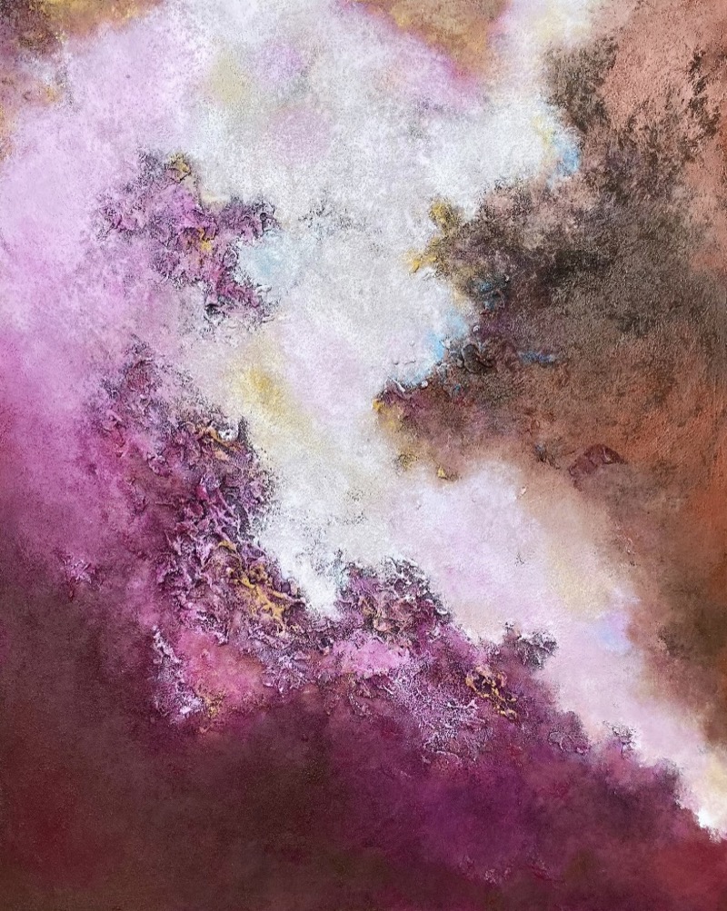 L’universo astratto di Julia Fernández Rebollo, in arte Artangelus, trova in “Mon chérie” una sintesi cromatica vibrante e materica. Abbandonando ogni residuo figurativo, l’opera esplora la potenza del gesto puro attraverso un contrasto tra tonalità prugna e bianchi eterei. Bagliori dorati squarciano la superficie stratificata, conferendo alla tela una profondità quasi tattile che sembra pulsare di vita propria. Attraverso questo lirismo astratto, l’artista sembra voler catturare l’essenza di un sentimento o di un ricordo caro, trasformando la tela in uno spazio sensoriale dove la luce emerge dall’ombra, invitando lo spettatore a un’interpretazione libera e puramente emozionale.