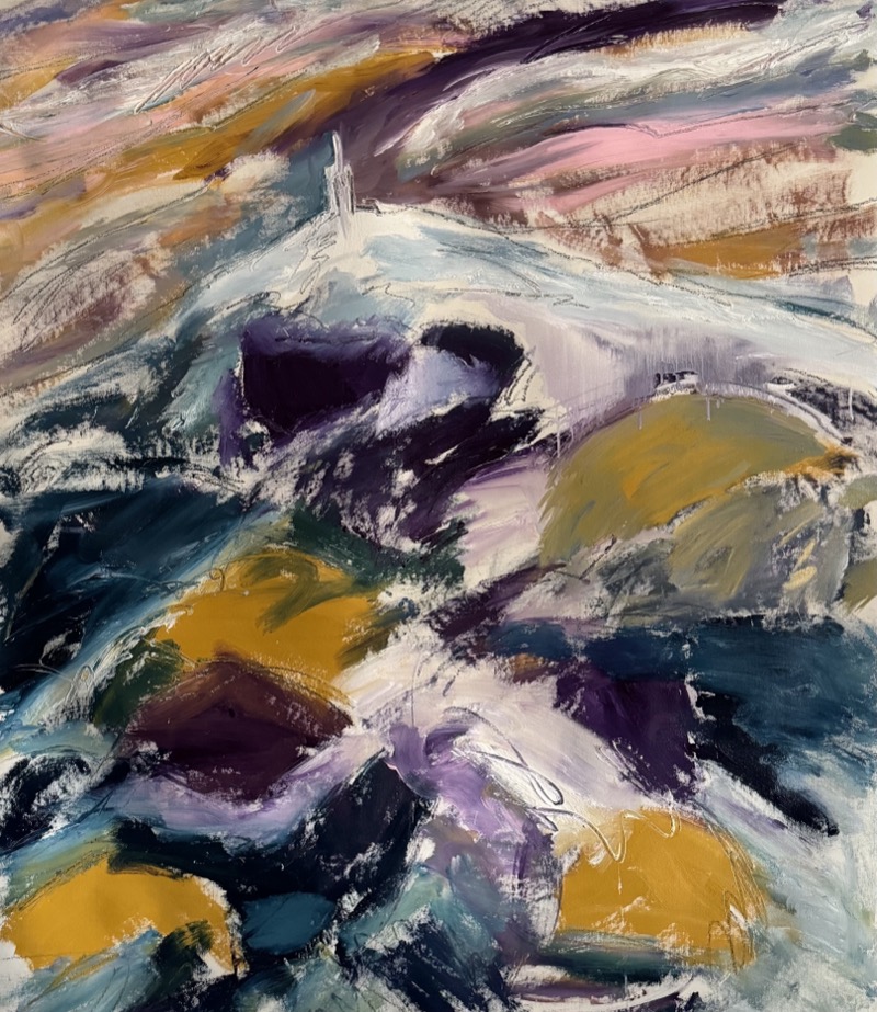 “Mont Ventoux” di H J (Herman Janssens) è un’opera che trasfigura il paesaggio in esperienza sensoriale pura. La vetta iconica diventa pretesto per un’esplorazione gestuale in cui il colore — gialli senape, viola intensi, turchesi profondi — si stratifica con dinamismo, evocando vento, luce e vertigine. La tecnica mista amplifica la materia pittorica, facendo vibrare la tela tra astrazione lirica e suggestione geologica. Al centro, una forma bianca affilata allude forse all’osservatorio, simbolo di solitudine e tensione ascensionale. L’opera abbandona la rappresentazione per restituire l’emozione dell’ascesa, il sublime nella sua forma più informale e interiore.