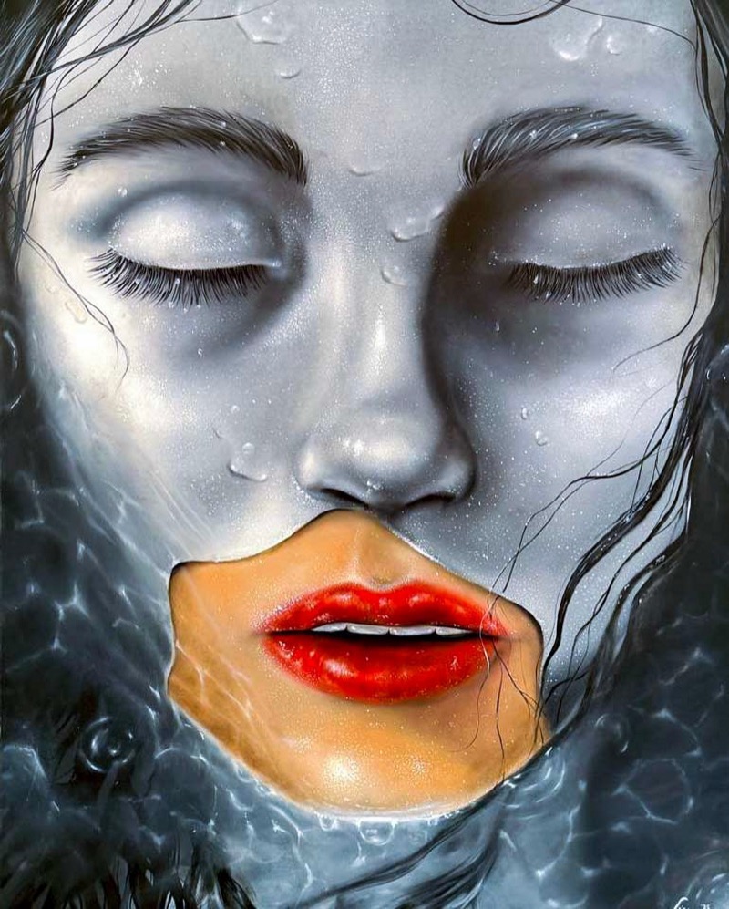 In “Morgana”, l’artista Lisa eleva la sua cifra stilistica: l’uso del colore come frammento di realtà viva in un contesto iperrealista. In questa maestosa tela a olio, il volto appare immerso in un’atmosfera onirica, reso attraverso grigi marmorei e riflessi acquatici cristallini. Il fulcro dell’opera risiede nelle labbra, dove esplode l’unica sezione cromatica naturale. Questo contrasto non indica una separazione fisica dall’acqua, ma rappresenta la firma dell’autrice: un risveglio sensoriale che ancora l’immagine al presente. La precisione tecnica delle trasparenze e il contrasto cromatico creano una tensione magnetica tra l’immobilità del mito e la vibrante vitalità contemporanea.