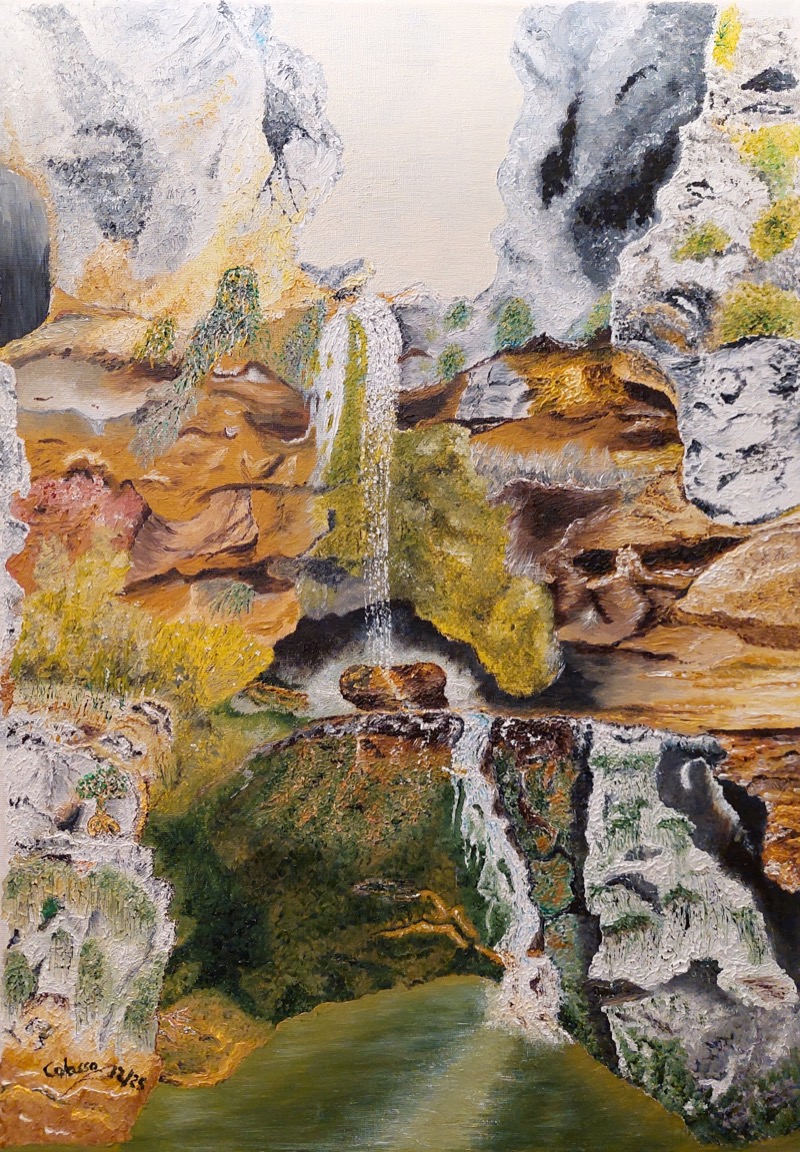 “Perseveranza (gutta cavat lapidem)” di Mario Calasso si configura come una meditazione pittorica sul tempo e sulla forza silenziosa della natura. La composizione, costruita attraverso una stratificazione materica densa, restituisce una gola rocciosa scavata dall’acqua, protagonista simbolica dell’opera. L’olio su tela esalta le superfici irregolari e i contrasti cromatici tra terre, verdi e grigi, suggerendo un dialogo continuo tra solidità e mutamento. La luce, filtrata e diffusa, accompagna lo sguardo verso il centro, dove il gesto ripetuto dell’acqua diventa metafora della perseveranza umana. L’opera unisce sensibilità naturalistica e riflessione esistenziale.