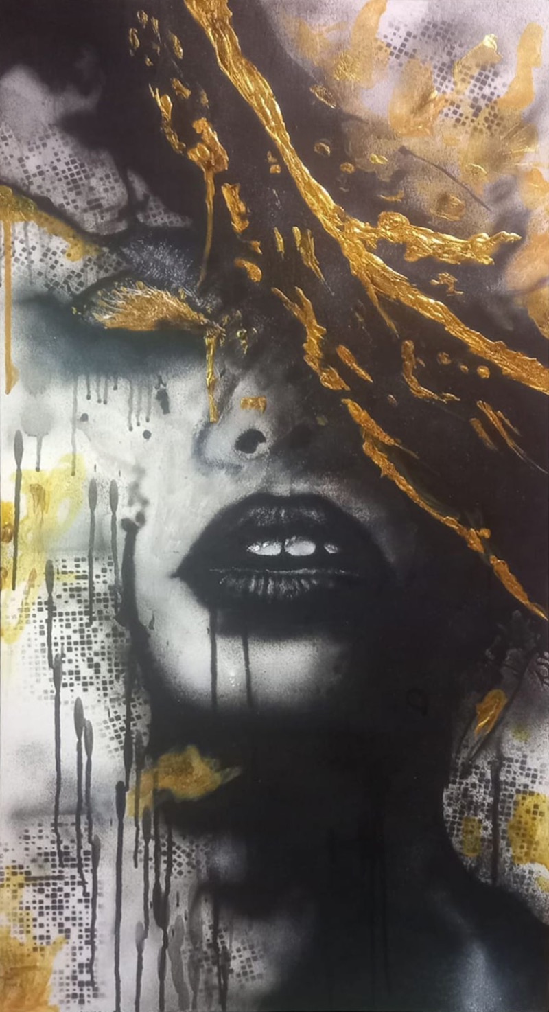 Ardo Borsari orchestra un dialogo serrato tra il volto umano e la materia grezza attraverso una sperimentazione tecnica poliedrica. L’uso dell’aerografo conferisce all’incarnato una morbidezza quasi fotografica, su cui intervengono con forza dirompente l’acrilico e gli strumenti per la lavorazione del legno. Le colate verticali e le dense stratificazioni dorate, applicate con spatole e incise dagli scavini, creano una tensione tra la delicatezza dello sguardo e la violenza del gesto plastico. L’opera si trasforma in un campo di battaglia espressivo dove la bellezza emerge tra lacerazioni e bagliori preziosi, interrogando la percezione dello spettatore sulla fragilità dell’identità contemporanea.
