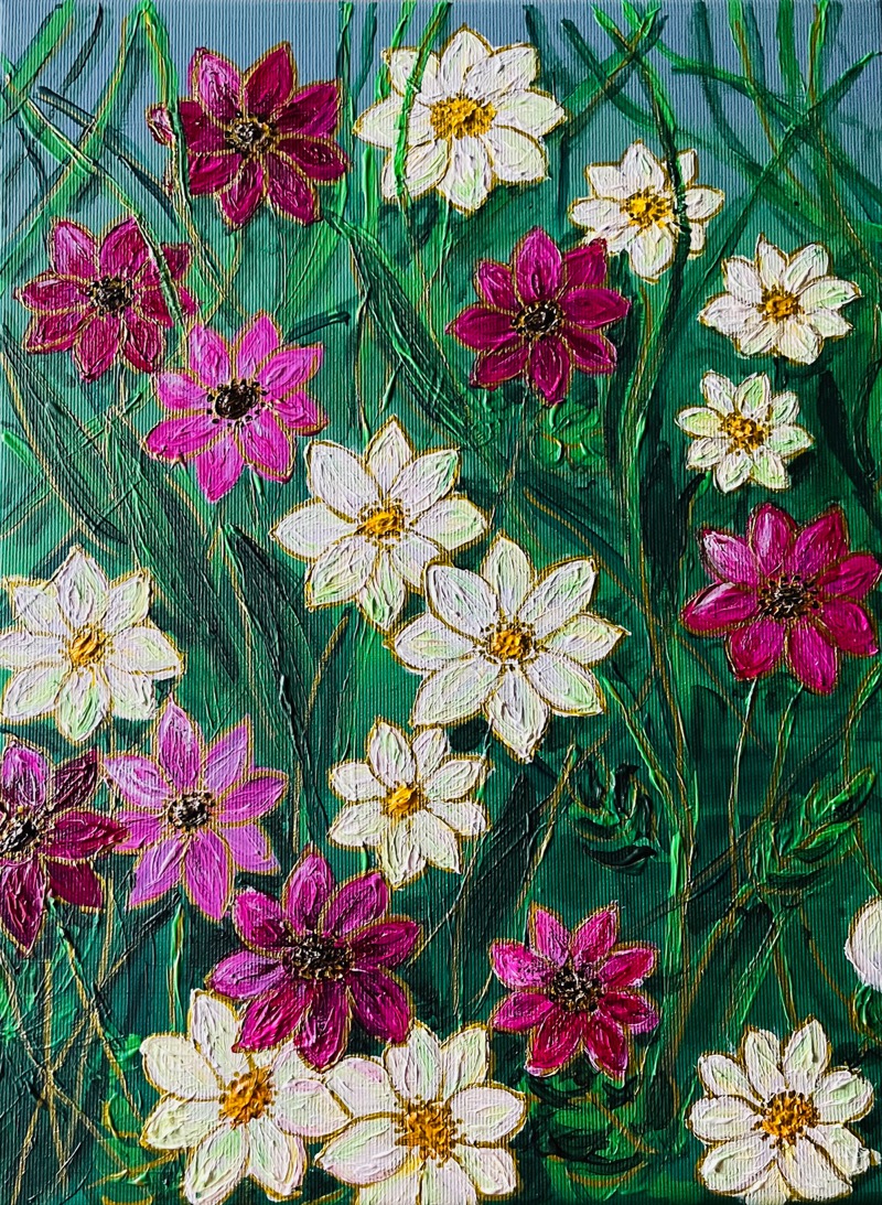 In quest’opera di Jankó Antal Árpádné, in arte Jankóné Teri, intitolata “Táncoló virágok” (Fiori danzanti), la natura si spoglia della sua staticità per farsi puro movimento ritmico. L’artista trasforma il piano pittorico in un prato vibrante, dove le corolle dai toni fucsia e bianco sembrano fluttuare su uno sfondo verde smeraldo profondamente materico. La forza del dipinto risiede nella pennellata corposa, che conferisce un rilievo quasi scultoreo ai petali, accentuando il senso di vitalità. L’alternanza cromatica e la disposizione apparentemente libera degli elementi floreali evocano una coreografia naturale, celebrando la gioia effimera e luminosa della fioritura con un linguaggio espressivo immediato e coinvolgente.