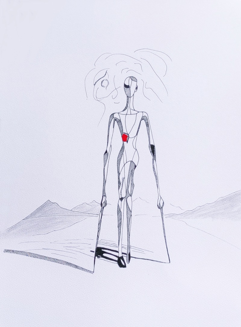 In “Verborgene Verbindungen”, Gido Heß (in arte Heß) esplora la fragilità dell’esistenza attraverso un linguaggio grafico essenziale e surreale. Realizzata con fineliner e matita su carta acquerello A3, l’opera mette in scena una figura filiforme, quasi robotica, che abita un paesaggio desertico e astratto. La composizione gioca su un netto contrasto: la precisione del tratto nero definisce una struttura umana precaria, dove l’unico elemento cromatico, un punto rosso sul petto, diventa il fulcro emotivo dell’immagine, simbolo di vita o vulnerabilità. Le linee sottili che fluttuano sopra la figura suggeriscono connessioni invisibili o pensieri aggrovigliati, traducendo visivamente la complessità dei legami interiori.