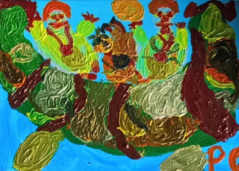 In “Viaggio sull’Arca” (acrilico su tela, 20 × 30 cm), Paola Caruso trasforma il gesto pittorico in un linguaggio primordiale e viscerale. Le figure emergono da un impasto cromatico denso, materico, che sfida i contorni e affida alla materia il compito di raccontare. L’arca, più che veicolo, diventa archetipo: rifugio, soglia, memoria collettiva. Il celeste del fondo fa da controcanto alle tonalità terrose, suggerendo un mare simbolico, quasi mentale. C’è un’energia infantile e arcaica nel tratto, che richiama l’arte naïf ma con un’urgenza espressiva quasi rituale. Un’opera piccola nel formato, ma carica di forza narrativa e iconica.